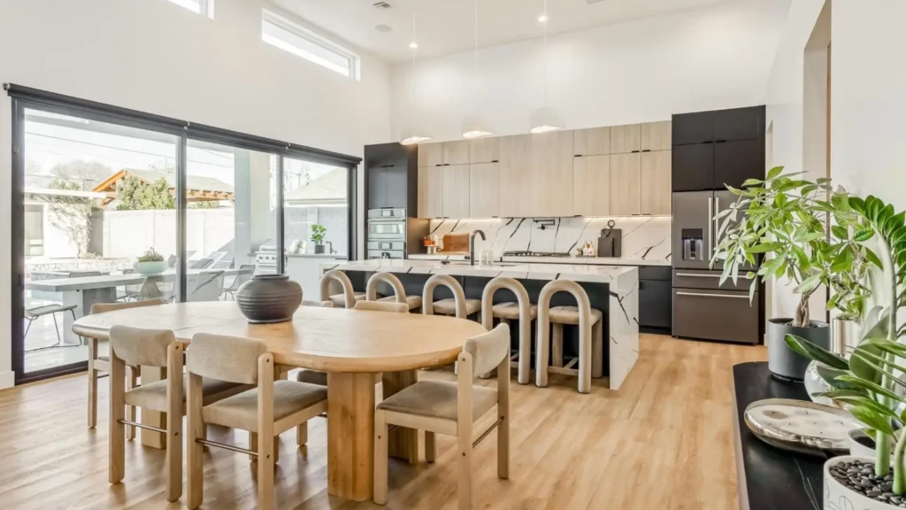 Flat-panel to lightly detailed wood cabinets with clean lines point to transitional design, not fully traditional or ultra-modern. Warm natural wood tones mixed with soft neutral walls keep it modern but approachable. Open-concept kitchen with a central island and adjacent dining space is very contemporary in function. Simple, clean chandelier and recessed lights support a contemporary feel without being stark.